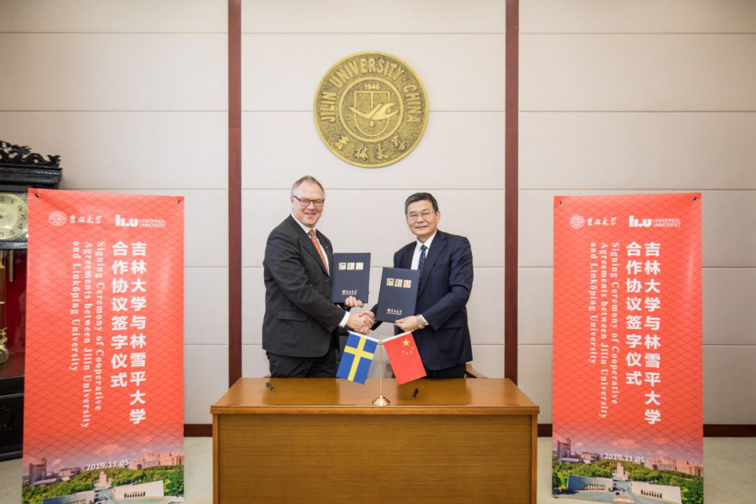 On November 5th, 2019, Professor Zheng Weitao, Vice President of Jilin University, met with a delegation of 6 people led by Professor Per-Olof Brehmer, Deputy Vice-Chancellor for Research, Professor Ulf Nilsson, Dean of Faculty of Engineering and Science, Linköping University. Professor Zheng Weitao and Professor Per-Olof Brehmer jointly signed the Memorandum of Understanding between Linköping University and Jilin University and Agreement on Articulation Programs between Linköping University and Jilin University. The two universities formally established the cooperative relationship.