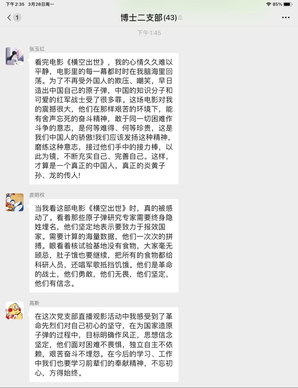目前红色电影周已连续观影四期已观看电影《横空出世》《中国医生》《八佰》《湄公河行动》等电影佳作。从老一辈革命者、科学家的为国捐躯到新世纪疫情肆虐下中国医疗工作者们的不惧生死,从救亡图存到抗击罪恶,每一段故事都值得每一位党员同志们用心铭记。观影结束后,各支部组织党员开展观影讨论和心得分享。