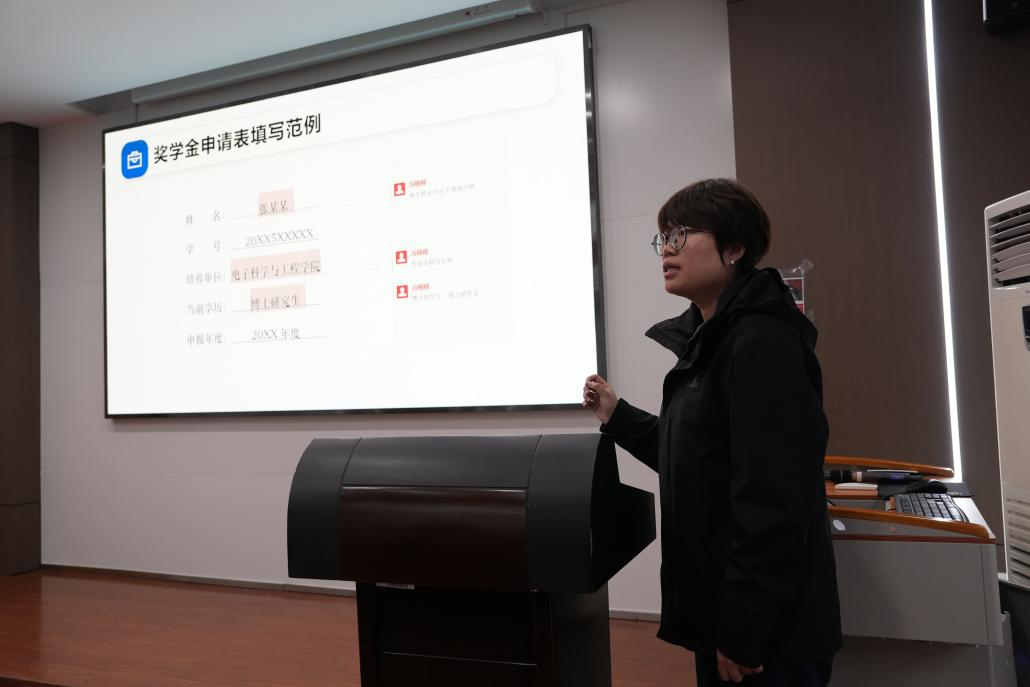 随后,冯楠楠针对各类申请表格的填写及个人事迹撰写相关要求进行了详细的讲解。她从表格的规范填写入手,对各类奖(助)学金申请表的涵盖内容和填写示例进行了分享。同时,她还强调了在个人事迹撰写技巧方面的注意事项。