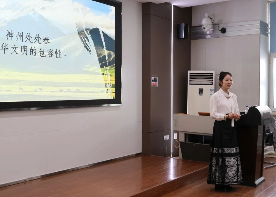 宣讲伊始,焦梦娟立足今年的政府工作报告,围绕“习近平文化思想”这一关键词,梳理了党的十八大以来有关“中华文化”和“文化自信”的阐释,剖析了以中华文化铸牢中华民族共同体意识的必要性与重要性。讲座以历代西域诗歌中“春”的描绘为中心,围绕春风吹拂不息、春暖花开塞外、神州大地春意盎然三个维度,深入剖析西域诗中“春”的文化意蕴。通过“情如春暖”的文化心理揭示中华文明的连绵不断,借生机勃勃的春日景象展现中华文明的创新精神,用春润万物的普遍性彰显中华文明的团结统一,以春风和煦的形态诠释中华文明的和平发展,以及通过春和并长的包容性突显中华文明的博大精深。讲座语言深入浅出,形式生动有趣,巧妙地将诗歌、文化、文明三者紧密相连。西域诗歌中“春”的描绘,真实生动地展现了中华文明的五个突出特性,以诗歌为历史说话,滋润人心,更好地发挥了铸牢中华民族共同体意识的重要作用。